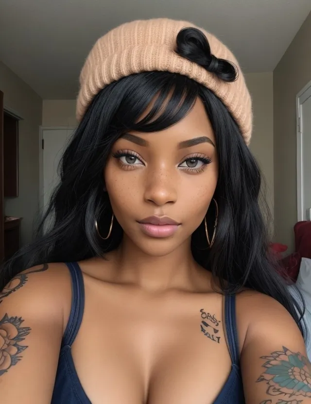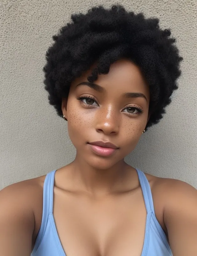 Jasmine Clarke is a stunning African-American woman with medium-length curly black hair, delicate freckles, and a small, meaningful tattoo on her body.